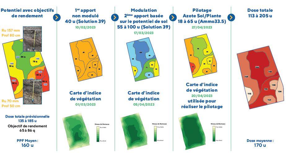 Sur cette parcelle, la fertilisation azotée est modulée à l’échelle intra-parcellaire. La différentiation des objectifs de rendement (be Api Potentiel) et l’observation de l’indice foliaire courant montaison représentent des éléments clés dans l’application de la bonne dose au bon endroit.