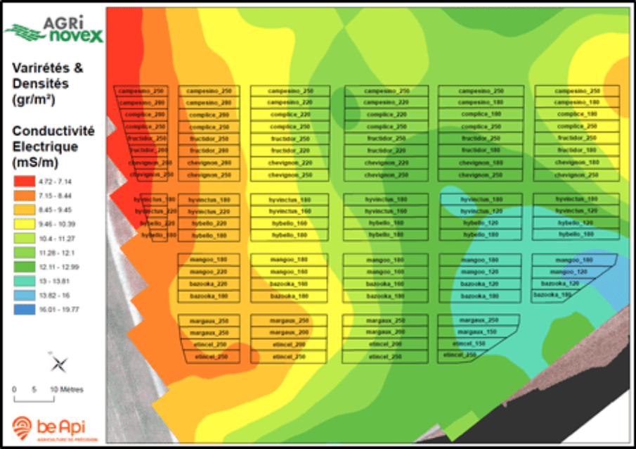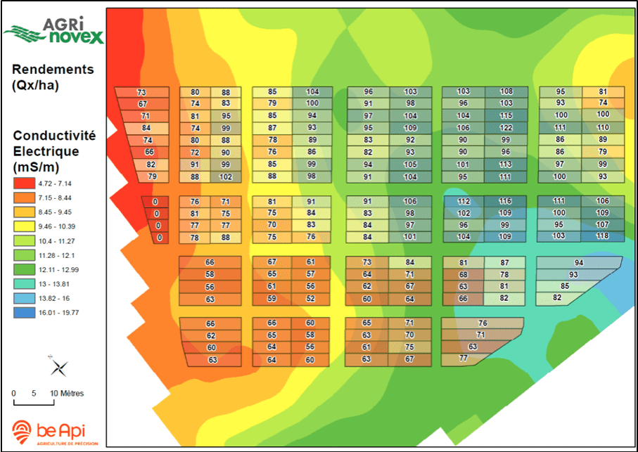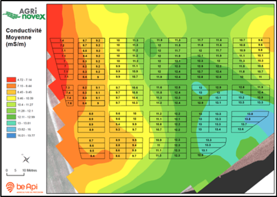 À noter que la carte de conductivité confirme ce que montre le révélateur d’hétérogénéité be Api : la zone du bas de la parcelle est plus hétérogène que le haut avec une partie qui décroche plus fortement (en bas à gauche de la parcelle).