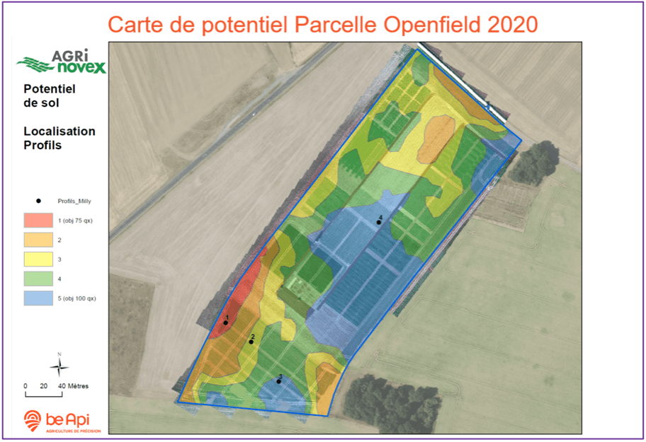Pour caractériser la variabilité intra-parcellaire du potentiel de production de la plateforme d’Openfield 2020 (6,5 ha), le diagnostic be Api Potentiel a été réalisé :
