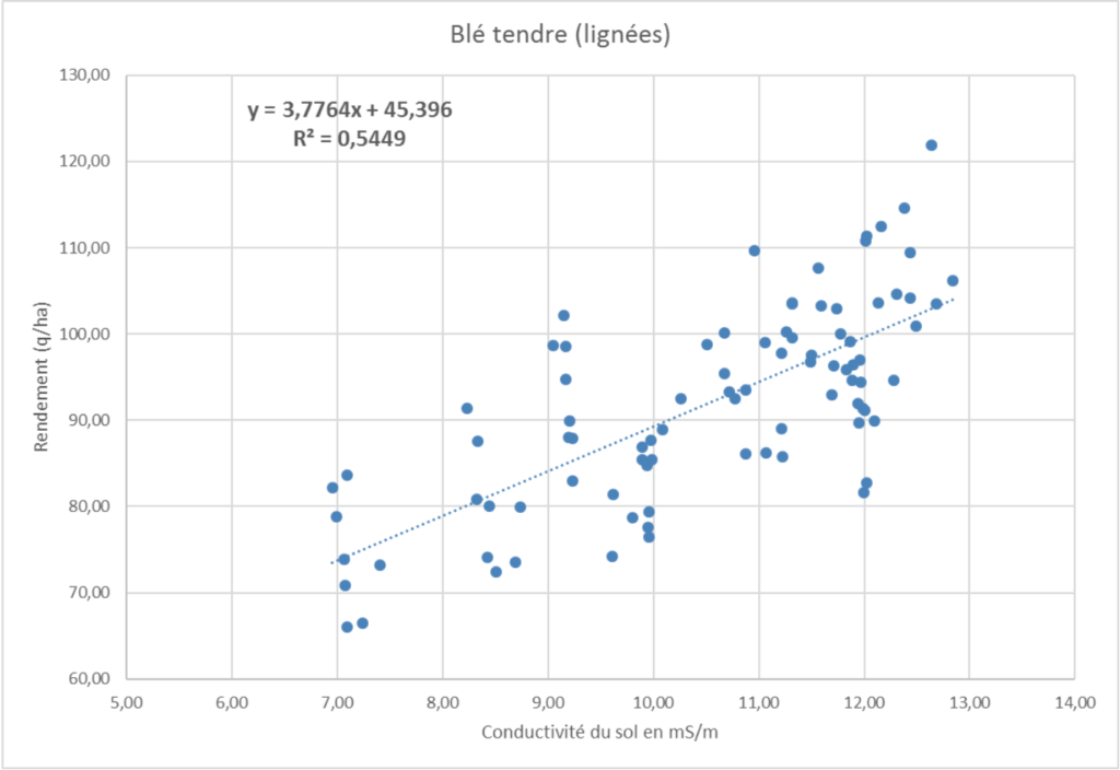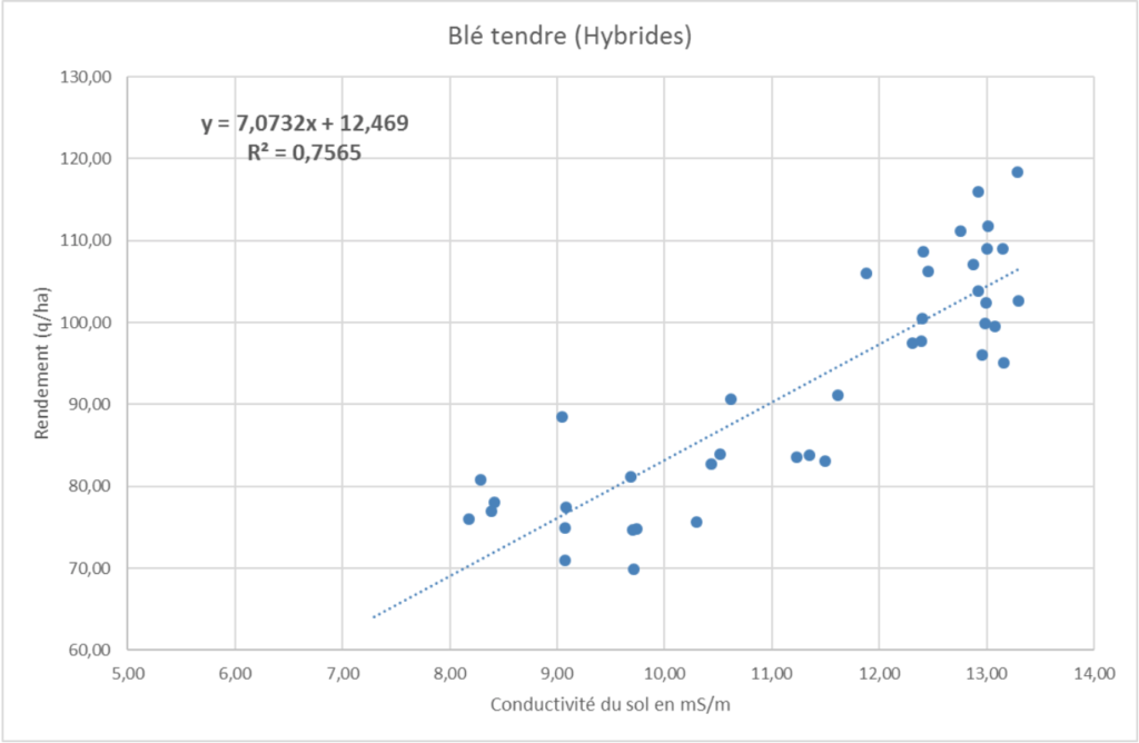 Tableau 1 : corrélation entre rendement (q) et conductivité du sol (mS/m) selon les variétés de blé