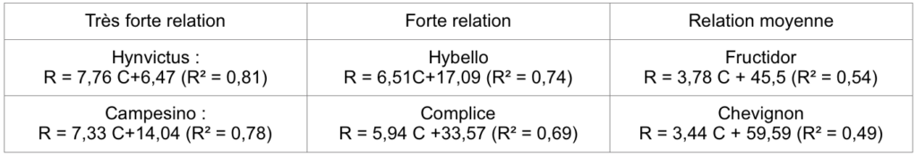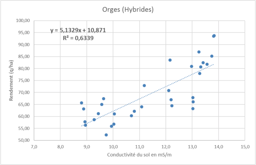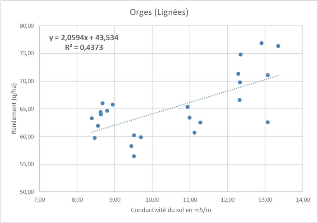 Tableau 2 : corrélation entre rendement (q) et conductivité du sol (mS/m) selon les variétés d’orge