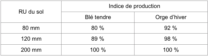 Les résultats de ce diagnostic justifient le fait de différencier les objectifs de production et d’adapter les conduites culturales. Le logiciel de conseil be Api permet de spatialiser les objectifs de production en fonction de la réserve utile d’eau du sol (voir tableau 1 ci-dessous) :