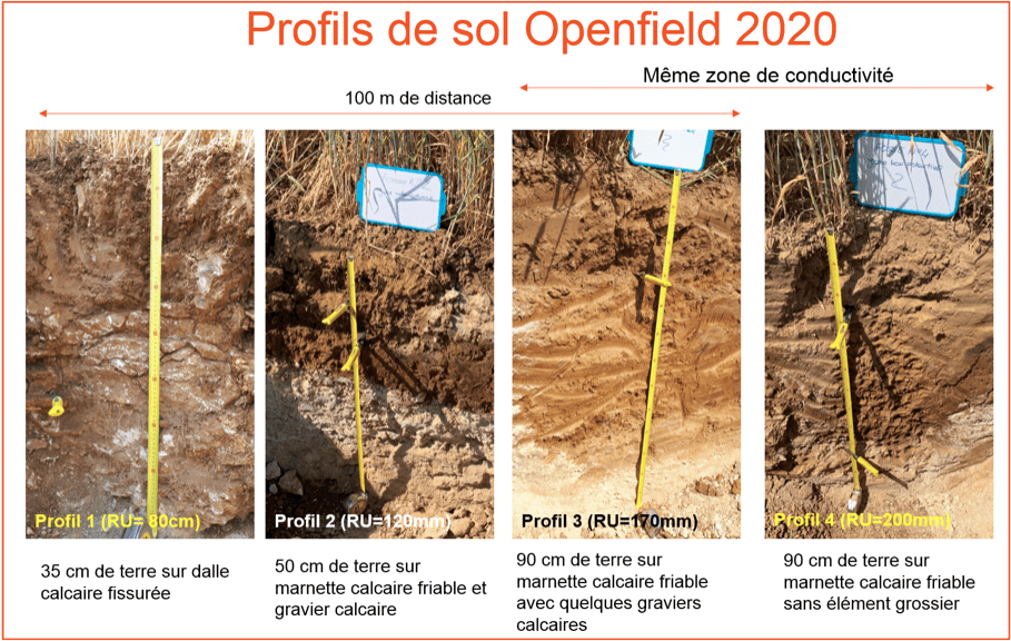 Fig. 3 : Les sols observés sur chaque zone de conductivité montrent des potentiels de production très variables allant de 75 q (profil de gauche) à plus de 100 q (profil de droite).
